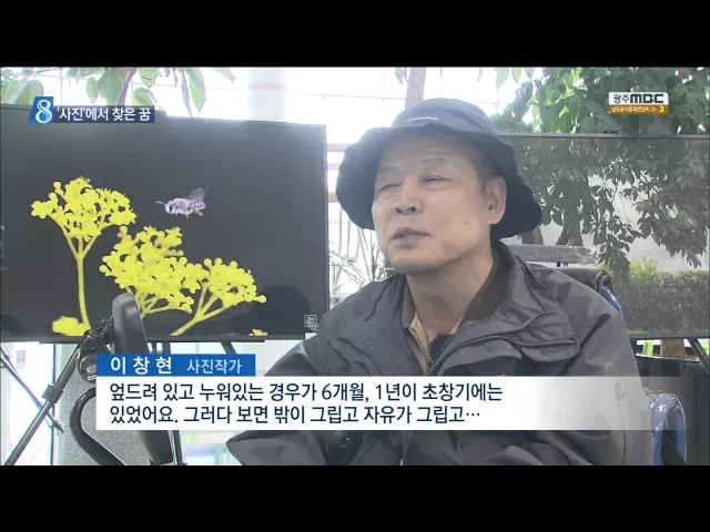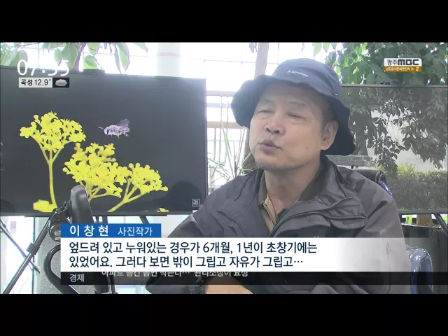 (앵커) ◀ANC▶ 불의의 사고로 지체 장애를 얻었지만 사진을 통해 주변의 소중한 것들과 교감을 나누고있는 장애인 사진작가가 있습니다 이제는 그 소중함을 다른 사람과도 나누고 싶다고 합니다. 이미지 뉴스리포터입니다. (리포터) ◀VCR▶ 꽃을 향해 날아든 벌 한마리. 수천 만 번은 움직였을 날개까지 사진 속에 선명...
