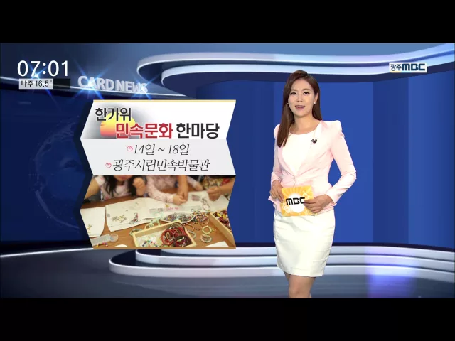 추석을 맞아 종합 선물세트같은 행사들이 지역 곳곳에서 열립니다. 오는 13일 5시에 유스퀘어 야외무대에서는 판소리와 무용 등을 감상할 수 있는 '한가위 국악 한마당'이 펼쳐집니다. 14일부터 닷세 동안 국립광주박물관에서는 전통놀이를 체험하고, 영화를 볼 수 있는 자리를 마련합니다. 같은 기간, 광주시립민속박물관...