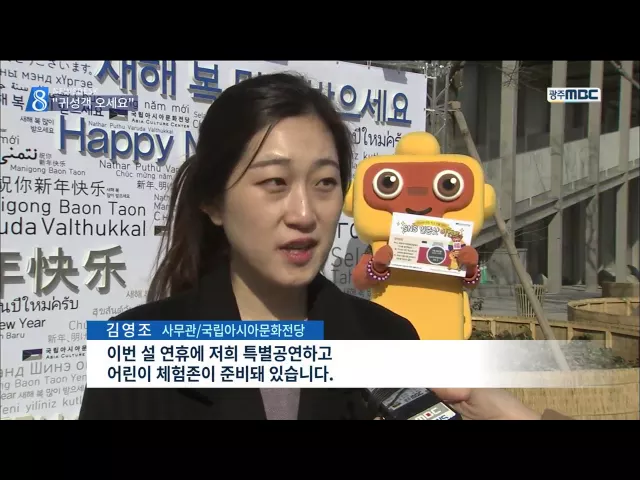 (앵커) 지난 추석, 문을 닫아 귀성객들을 아쉽게 했던 국립아시아문화전당이 이번 설 명절에는 무료 개방합니다. 이외에도 다양한 문화행사가 광주에서 열리고 있으니 오랜만에 만난 가족들과 나들이 어떠실까요? 김인정 기자입니다. (기자) 아시아 13개 국 언어로 쓰인 "새해 복 많이 받으세요"! 설 명절을 맞아 가족과 함...