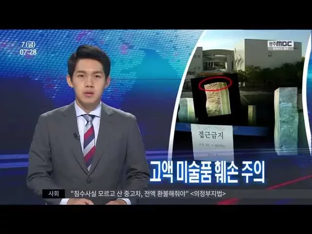(앵커) 국제적 전시인 비엔날레에서는 전시 성공만큼이나 작품의 안전한 관리와 운송이 중요한데요. 광주 비엔날레 재단이 외국 전시작품을 훼손해 1억원을 배상했습니다. 김인정 기자입니다. (기자) 1톤에 가까운 3개의 석조로 이뤄진 미국작가 제임스 리 바이어스의 작품. (c.g)지난 2010년 광주 비엔날레에 전시됐다 운...