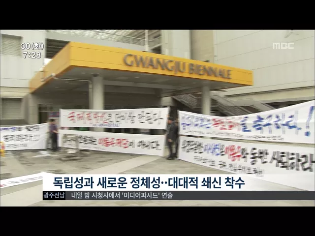 (앵커) 창설 20년주년을 맞은 광주 비엔날레는 올 한해 혹독한 성년식을 치렀습니다. 기왕에 겪은 진통이라면 새로움을 탄생시킬 산통이거나 성숙을 담보하는 성장통이기를 바랍니다. 박수인 기자입니다. ◀VCR▶ 박근혜 대통령을 허수아비로 풍자한 이 한장의 그림이 광주 비엔날레 20주년 특별전을 파국으로 몰아갔습니...