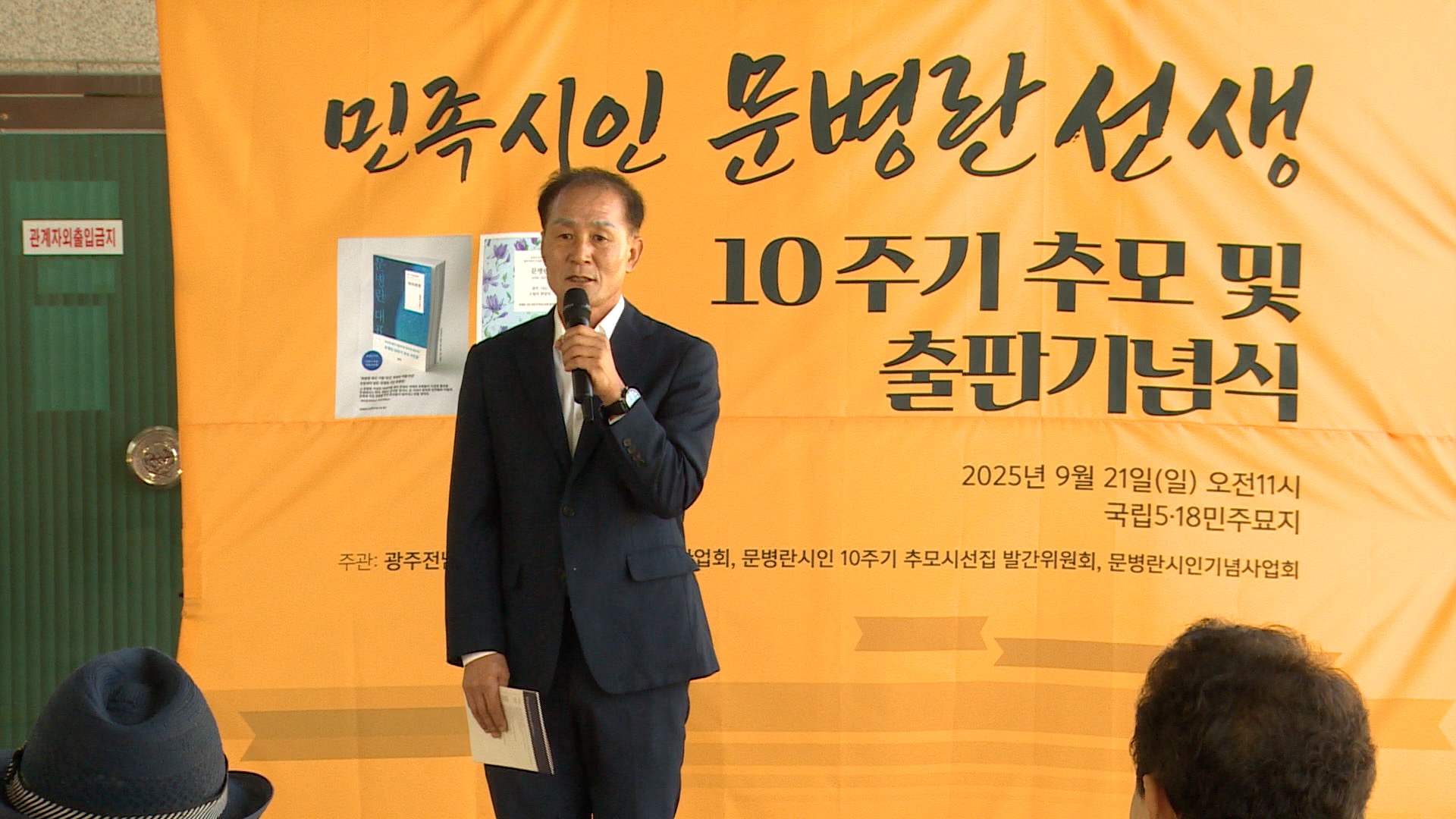 고 문병란 시인의 10주기 추모시집이 나왔습니다.문병란시인기념사업회는 오늘(21일) 국립5.18묘지에서 10주기 추모식과 함께 추모 시선집 '직녀에게' 출판기념회를 열었습니다.10주기 추모시집은 동료 시인과 제자, 학계 인사 등이 추천한 작품 60편으로 구성됐습니다.문병란 시인은 통일과 민주화에 대한 염원을 시로 승...
