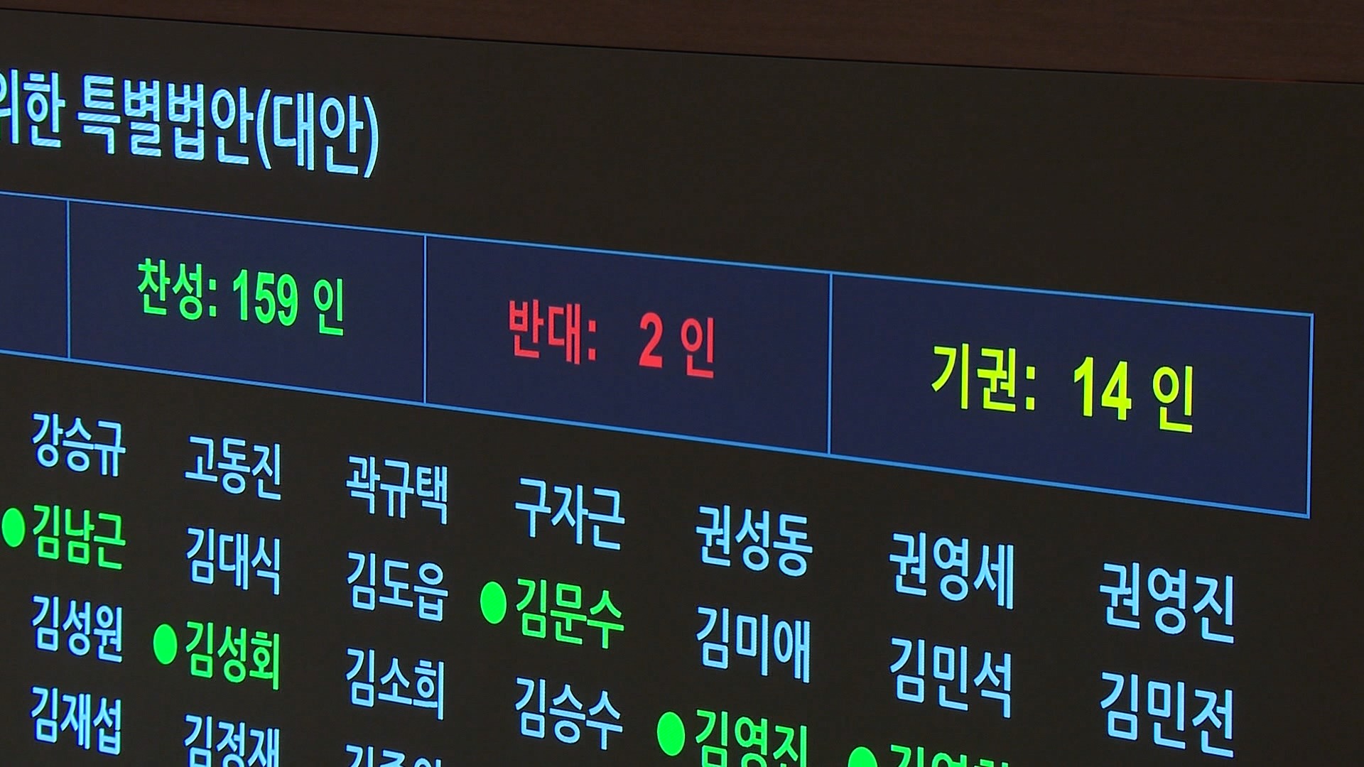 전남·광주 통합 특별법이 범여권 주도로 오늘(1)국회 본회의를 통과했습니다.재석 175명 중 찬성 159표, 반대 2표, 기권 14표로 의결됐으며, 국민의힘 의원들은 여당의 일방적 법안 처리에 반발하며 본회의에 불참했습니다. 해당 법안은 지난달 24일 국회 법제사법위원회 전체회의에서 통과됐지만, 함께 논의됐던 대구·경북...