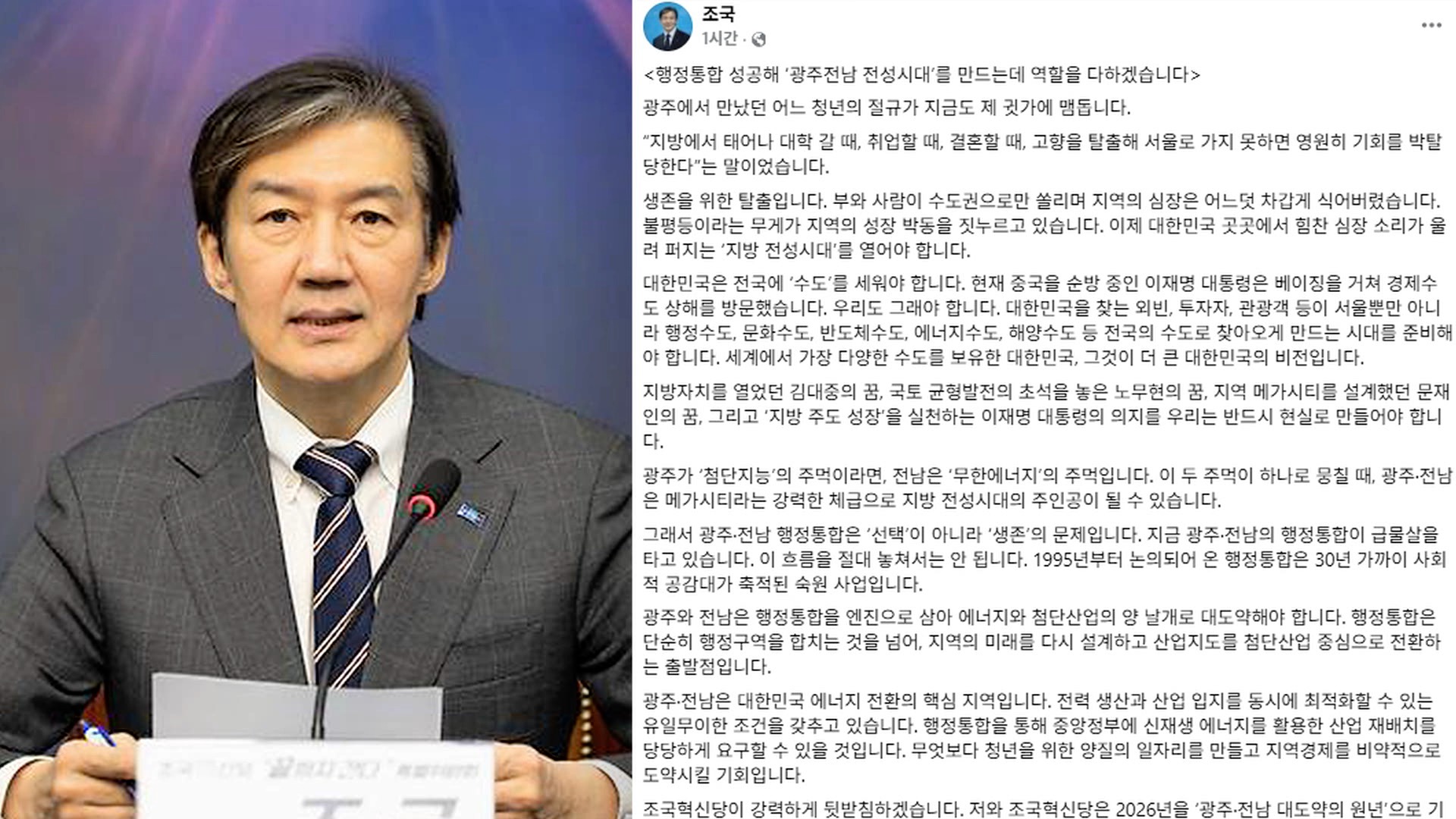 조국혁신당 조국 대표가 광주전남 행정통합을 강력하게 뒷받침하겠다고 밝혔습니다.조 대표는 자신의 페이스북을 통해"2026년을 ‘광주·전남 대도약의 원년’으로 기록하기 위해 모든 역량을 투입하겠다"며"광주·전남이 행정통합을 통해 서울에 준하는 위상과 조직 특례를 확보하고, 교부세 추가 배분과 공공기관 우선 이전이...