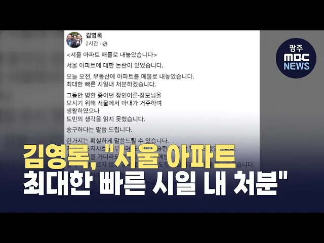 김영록 전남광주통합특별시장 민주당 예비후보가 논란이 됐던 서울 아파트를 매물로 내놓았다고 밝혔습니다.김 예비후보는 자신의 sns에"병환 중이던 장인어른과 장모님을 모시기 위해 서울 아파트에서 아내가 거주하며 생활했다"며 "최대한 빠른 시일 내에 매도하겠다"라고 밝혔습니다.한편 신정훈 예비후보는어제(25) KBC...