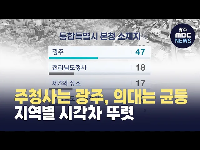 (앵커)이번 여론조사에서는 통합특별시가 앞두고 있는 지역 현안에 대해서도 물었는데요.통합청사 위치부터 국립의대 배치 방식까지, 현안을 바라보는 광주와 전남 시도민들의시각차는 뚜렷했습니다.향후 지역 갈등을 조정하는 것이 차기 특별시장 선거의 최대 과제가 될 전망입니다.이어서 이재원 기자입니다.(기자)가장 ...