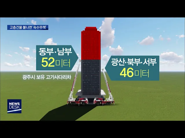 (앵커) 광주에는 30 층 넘는 건물이 80 개 동에 이릅니다. 앞으로도 고층 건물은 계속 늘어날 텐데 혹시라도 불이나면 어쩌나 걱정이 앞섭니다. 광주지역 소방서에 있는 고가 사다리차로는 30층은 커녕 20층까지 닿기도 어렵기 때문입니다. 우종훈 기자가 취재했습니다. (기자) 지난해 준공된 광주 북구의 한 주상복합 건물...
