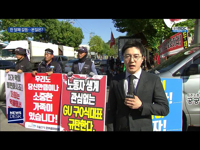(앵커) 요즘 코카콜라 광주공장이 시끄럽습니다. 운송료 정상화를 요구하는 화물차 기사들과 운송회사측이 이견을 좁히지 못하면서 하루가 멀다하고 물리적 충돌이 벌어지고 있습니다. 문제의 본질은 화물차 기사들이 특수고용노동자 신분이라는 데 있다고 합니다. 어떤 사정인지 송정근 기자가 취재했습니다. (기자) 코카...