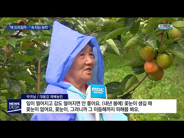 ◀ANC▶ 전남에서는 70% 이상이 아직 벼를 수확하지 않았습니다. 과일도 마찬가지입니다. 수확기에 올라오는 태풍 때문에 농민들이 걱정하고 있습니다. 윤수진 기자가 취재 했습니다. ◀END▶ (영암군 학산면) 누렇게 익은 벼들이 이른 아침부터 내린 비에 맥없이 쓰러지고 있습니다. 물기를 머금은 이삭이 무게를 견디지...