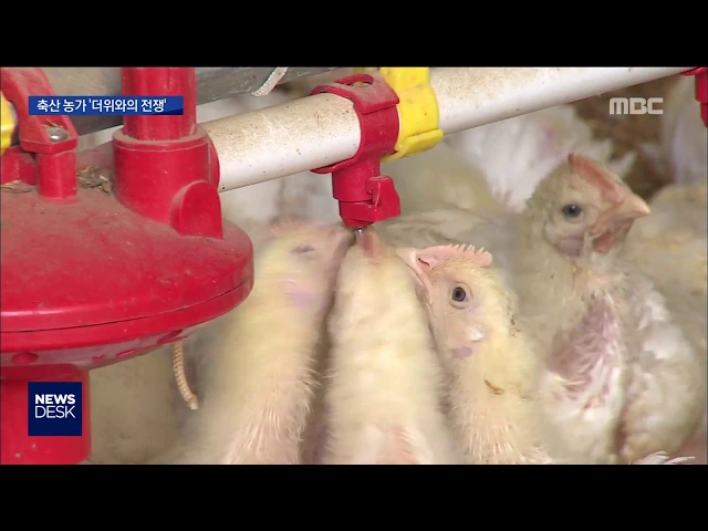 ◀ANC▶ 축산 농가에도 비상이 걸렸습니다. 벌써부터 여기저기서 가축이 떼죽음하는 피해가 잇따르고 있습니다. 박영훈 기자입니다. ◀END▶ 8만 마리의 닭을 키우고 있는 농가. 농장안 온도가 30도로 치솟는 오전 10시부터 통풍시설에 선풍기까지, 온도 낮추기에 분주합니다. 더위에 지친 닭들은 연신 목을 축이고 있습...