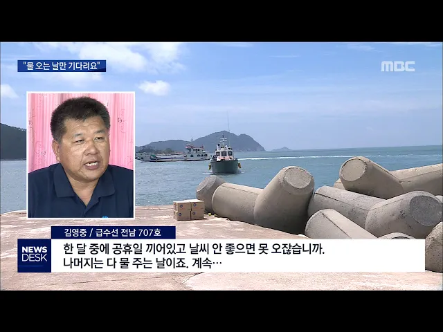 ◀ANC▶ 아무리 더워도 도시에선 물 걱정은 안 합니다만 섬지역에서는 식수난이 심해지고 있습니다. "1년 365일이 가뭄"이라는 외딴 섬에 양현승 기자가 다녀왔습니다. ◀VCR▶ 진도 팽목항에서 뱃길로 1시간 떨어진 진목도. 80대 주민들을 중심으로 10여 세대가 살고 있습니다. (S.U)이 섬은 저수지도, 바닷물을 민물로 ...