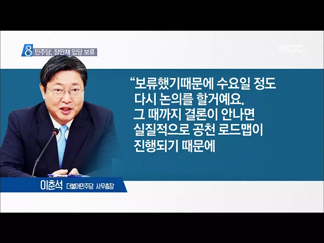◀ANC▶ 민주당이 장만채 전 교육감의 입당 승인을 보류했습니다. 대선 당시 안철수 후보 초청 강연회를 여는 등 민주당과의 정체성에 논란이 있다는 겁니다. 김영록, 신정훈, 장만채 3파 전으로 예상됐던 민주당 도지사 후보 경선도 새로운 국면을 맞게 됐습니다. 박영훈 기자입니다. ◀END▶ 더불어민주당이 장만채 전 ...
