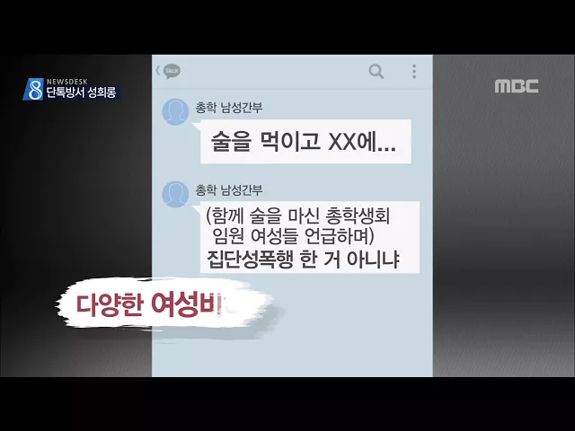 ◀ANC▶ 성폭력을 폭로하는 '미투 운동'의 확산 속에 대학가에서 비상식적인 일이 벌어졌습니다. 광주 모 대학의 총학생회 간부들이 단체 채팅방에서 여학생을 성희롱하고 비하하는 내용이 공개돼 물의를 빚고 있습니다. 해당 학생들은 총학생회를 사퇴했고, 대학은 징계 절차에 착수했습니다. 김인정 기자입니다. ◀VCR...