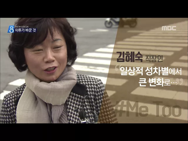 ◀ANC▶ 그렇다면 미투 운동은 우리 사회의 무엇을 바꾸고 있을까요? 각계 각층의 시민들은 변화와 진전을 향한 발걸음을 내디뎠다는 점에서 의미를 두고 있는데요.. 시민 인터뷰를 모아봤습니다. 직접 한번 들어보시죠.. ◀VCR▶ 김혜숙 / 직장인 "많이 변화했죠. 예전에는 우리도 늘 그런 일이 있었음에도 불구하고 말...