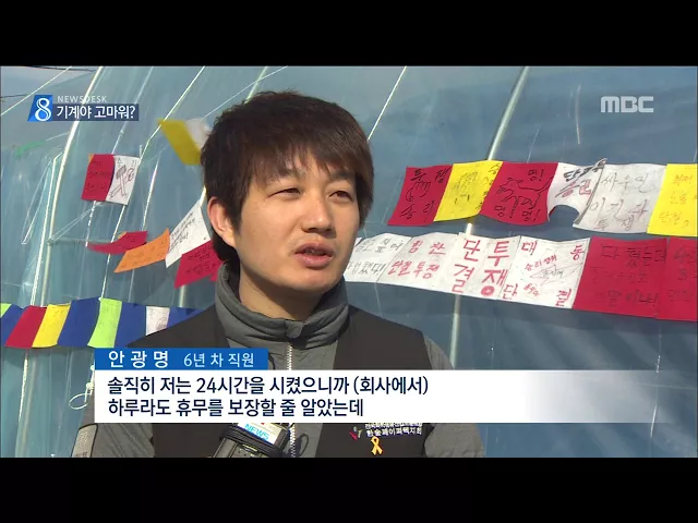 (앵커) 오늘은 현장 일터에서 육체적, 정신적으로 고통받고 있는 근로자들의 얘기로 시작합니다. 작업 시작 전에 공장 기계에 인사를 하고, 많게는 24시간 철야 중노동을 하지만, 임금은 최저 수준에도 못 미치는... 바로 담양에 있는 제지회사 한솔 페이퍼텍 얘깁니다. 참다 못해 50일 넘게 파업 중인 근로자들의 외침을 ...