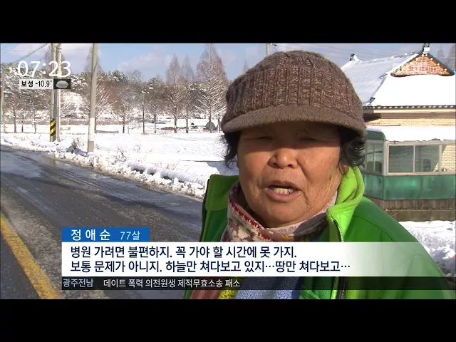 ◀ANC▶ 이런 한파 속에 몸이 아파도 병원조차 가지 못하는 사람들이 있습니다. 지난 사흘동안 내린 폭설로 고립돼 버스도 다니지 못하는 마을 주민들을 김인정 기자가 만나고 왔습니다. ◀VCR▶ 하얀 눈으로 뒤덮힌 광주 외곽의 작은 마을. 폭설 속에 시내버스가 끊긴 지 며칠째라 노부부의 외출 역시 방법이 없어졌습니...