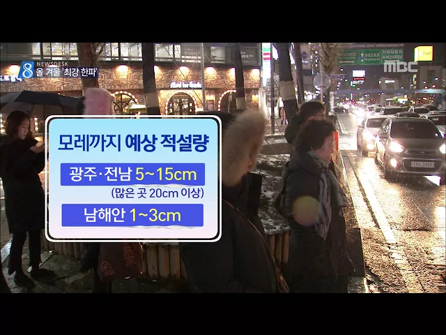 (앵커멘트) 눈도 눈이지만 올겨울 들어 가장 강력한 한파도 기다리고 있습니다. 내일 아침 역시 빙판길과 함께 강추위에 대비하셔야 할 것 같습니다.. 현장 연결해 자세한 날씨 알아보겠습니다. 백단비 캐스터! 지금도 눈이 내리나요? (또는 내일은 더 춥죠?) (캐스터) 네, 현재 눈을 뜨기 힘들 정도로 눈이 거세게 내리는 ...