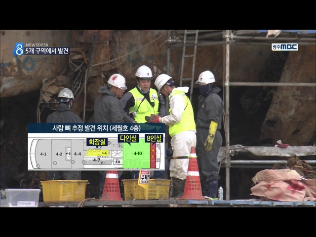 ◀ANC▶ 세월호 곳곳에서 사람의 것으로 보이는 뼈가 발견되고 있습니다. 객실과 화장실 등 5곳에서 따로 발견되고 있는 만큼 미수습자를 모두 찾을 수 있을지 관심입니다. 김진선 기자입니다. ◀END▶ ◀VCR▶ 일반인 승객들이 머물렀던 세월호 3층에서도 사람의 것으로 추정되는 뼈가 잇따라 발견됐습니다. [반투명] 2...