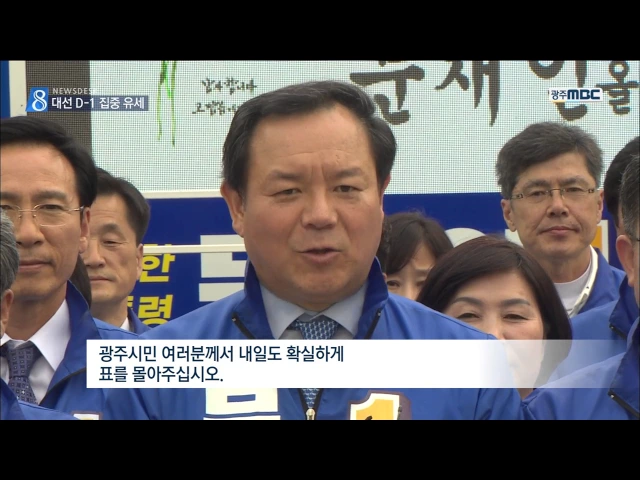 대선이 코 앞으로 다가오면서 대선 후보들의 막바지 표심 잡기 경쟁이 뜨겁습니다. 문재인 후보는 1강 체제 굳히기에 들어갔고 안철수 후보 등 나머지 후보들은 뒤집기를 자신하며 막파 바람몰이에 나섰습니다. 박수인 기자 ◀VCR▶ 더불어민주당 문재인 후보는 선거일 전 마지막 휴일 저녁을 광주에 할애했습니다. 선거운...