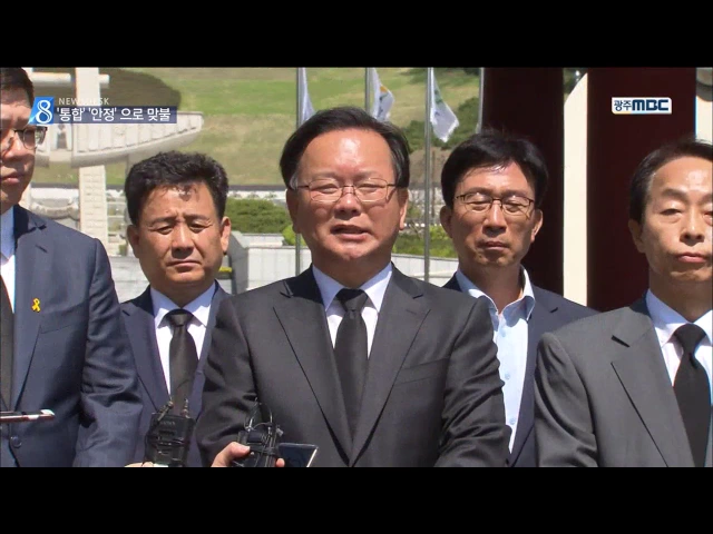 (앵커) 안철수 후보의 광주 전남 방문에 맞서 민주당에서는 공동 선대위원장들이 나섰습니다. 안 후보가 미래를 강조했다면 문 후보측은 통합과 안정에 방점을 뒀습니다. 윤근수 기자 (기자) 김대중 전 대통령의 아들과 김영삼 전 대통령의 아들, 그리고 대구에서 당선된 김부겸 의원이 국립 5.18묘지 앞에서 손을 맞잡았습...