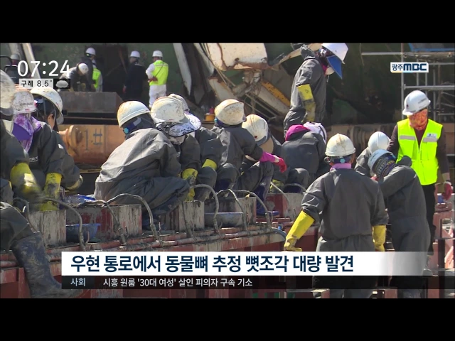 ◀ANC▶ 세월호 선내에서 미수습자를 찾기 위한 수색이 일주일째 접어들었습니다. 선내와 침몰해역에서는 동물뼈로 추정되는 뼛조각이 계속 발견되고 있습니다. 김진선 기자입니다. ◀END▶ ◀VCR▶ 왼쪽으로 드러누운 모양으로 그대로 거치된 세월호 선체. 하늘을 향해있는 우현에서도 선체 안으로 진입할 수 있는 출입...