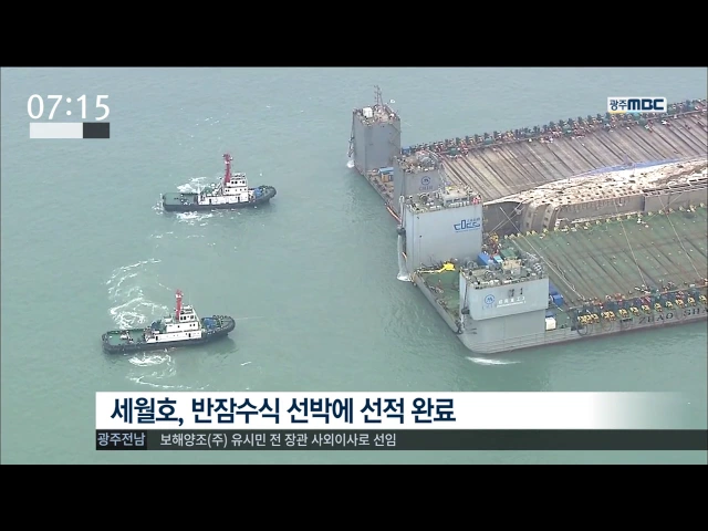 ◀ANC▶ 가장 조심스러운 공정으로 꼽혔던 세월호를 반잠수식 선박에 올리는 작업이 완료됐습니다. 선체 내부 물을 빼는 공정이 남아있는데, 이 과정에서 잔존유 유출이 우려되는데요, 진도 동거차도에 나가있는 취재기자를 전화로 연결하겠습니다. 양현승 기자, 전해주시죠. ◀END▶ ◀VCR▶ 네 세월호가 반잠수식 선...