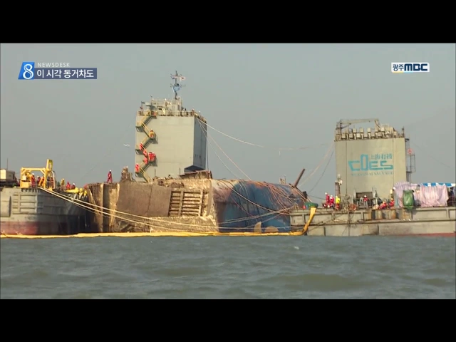 ◀ANC▶ 소조기 마지막 날인 오늘 세월호 인양 작업은 급박하게 이뤄졌습니다. 긴장감 속에 세월호 가족들은 오늘도 맹골수로에서 현장을 지켜봤습니다. 양현승 기자입니다. ◀END▶ ◀VCR▶ 마침내 세월호가 움직였습니다. (effect) 오늘 아침 수면 위 13미터 높이까지 떠오른 뒤 핵심 공정에 돌입했습니다. 잭킹바지...