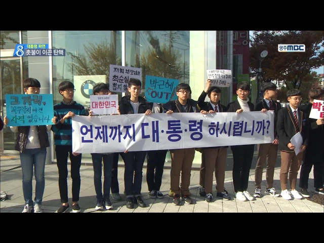 (앵커) 시청자 여러분 안녕하십니까. 이어서 광주전남 뉴스데스크입니다. 박근혜 전 대통령 탄핵을 환영하는 촛불집회가 광주에서도 열리고 있습니다. 규탄 성격이 강했던 그동안의 집회와는 다른 모습인데요. 새로운 대한민국을 바라는 시민들이 모여 축제의 장을 만들고 있습니다. 금남로에 나가 있는 취재기자 연결하겠...