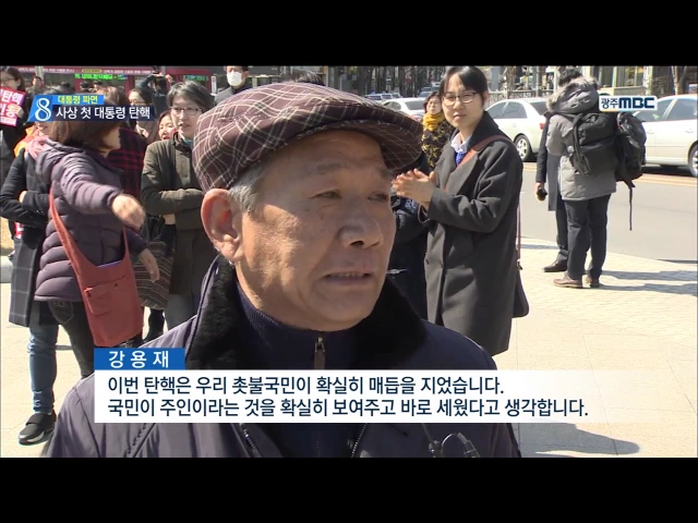 ◀ANC▶ 올겨울 광장을 촛불로 달군 국정농단 사태가 결국 역사상 첫 대통령 파면으로 이어졌습니다. 탄핵 인용 소식을 접한 광주지역 시민들은 당연한 결과다, 국민의 승리다, 라는 반응을 보였습니다. 김인정 기자입니다. ◀VCR▶ 헌재의 결정문 낭독이 이어지던 시각. 촛불집회를 열던 광장에서 시민들은 대형스크린을...