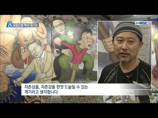 (앵커) 박근혜 정부에서 걸리지 못했던 홍성담 작가의 '세월오월' 전시 계획이 확정됐습니다. 책임자들이 작가에게 사과하고 이번 사태와 관련한 백서도 만들기로 했습니다. 김철원 기자가 취재했습니다. (기자) 박근혜 대통령을 허수아비로 묘사한 홍성담 작가의 '세월오월'. 작가가 그림을 광주비엔날레 특별전에 가져갔...