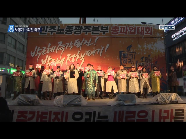(앵커) 정권 퇴진 운동..이번에는 노동계였습니다. 노동자들은 국정 농단을 규탄함은 물론, 정경 유착의 재벌 해체를 주장하며 총파업 투쟁을 벌였습니다. 정용욱 기자입니다. (기자) ◀SYN▶ 전국 동시다발 총파업 투쟁이 광주전남에서도 진행됐습니다. 정권 퇴진 파업으로는 지난 1987년 6월 항쟁 이후 30년만입니다. 광...