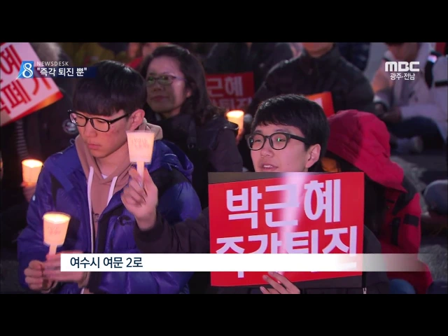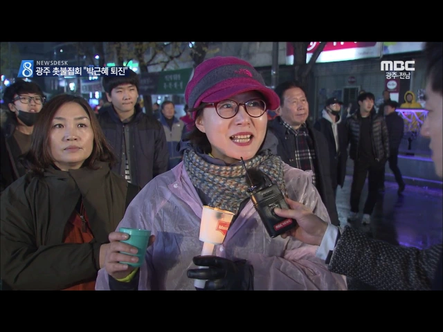 ◀ANC▶ 주말마다 대통령 퇴진을 요구하는 촛불이 타오르는 건 전남에서도 이제 당연한 일이 되고 있습니다. 대통령 탄핵안 처리를 놓고 머뭇거린 야권을 향한 비판도 쏟아지고 있습니다. 양현승 기자입니다. ◀END▶ ◀VCR▶ 땅거미가 지자 어김없이 시민들은 촛불을 들고 광장에 모였습니다. 횃불도 타올랐습니다. 민...