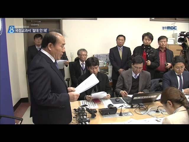 (앵커) 교육당국과 시민,사회는 당장 발끈했습니다. 밀실에서 추진된 국정 역사 교과서가 교육현장에 발붙이지 못하도록 하겠다고 경고했습니다. 이어서 한신구 기자의 보도 (기자) 집필진도 .. 편찬 심의위원도 몰랐고 의견수렴 절차도 깜깜이인 밀실정책의 표본이다 장휘국 광주시교육감은 반헌법적, 비민주적, 반역사적...