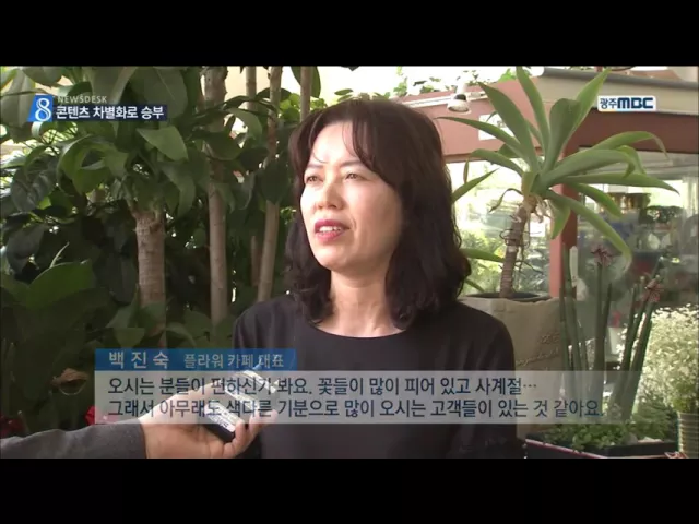 (앵커) 이렇게 치열해진 경쟁 속에서 살아남기 위해서는 차별화된 뭔가가 필요할 텐데요. 생존을 위한 커피숍의 변신을 이미지 뉴스 리포터가 전해드립니다. (기자) 커피에서 싱그러운 자연의 향기가 묻어나는 듯한 플라워 카페... 1백여 가지의 꽃과 식물이 커피숍 안팎을 화려하게 수놓으면서 매장으로 발길을 유혹합니다...