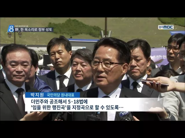 (앵커) 오늘 기념식에 참석한 야당 정치인들도 정부를 한 목소리로 성토했습니다. '기념곡 지정을 관철시키겠다' '오월 정신을 계승하겠다'는 약속과 다짐도 이어졌습니다. 한신구 기자입니다. (기자) '국론 분열' 운운하며 '임을 위한 행진곡' 제창을 끝내 거부한 정부에 대해 정치권의 비판이 쏟아졌습니다. ◀SYN▶안철...