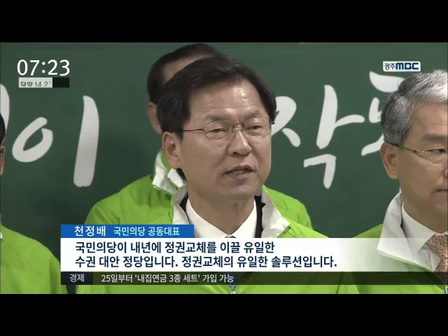 (앵커) 국민의당은 광주시민의 위대한 선택으로 4.13 정치 혁명이 시작될 것이라며 시민들의 압도적인 지지를 호소했습니다. 윤근수 기자입니다. (기자) 국민의당 광주지역 후보들은 광주에서 시작된 녹색 바람이 대한민국에 몰아치고 있다고 주장했습니다. 광주시민들이 일궈준 이 바람으로 총선에서 승리하고 호남 주도의...
