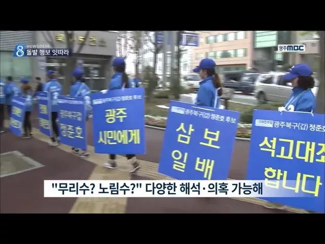 (앵커) 선거 판세에 따라 정당은 물론 후보자들의 선거운동 전략도 달라질 수 밖에 없을 텐데요. 경합지역이나 열세에 있는 후보들은 종종 무리수를 두기도 합니다. 광주에서 그런 일이 잇따르고 있습니다. 김인정 기자가 보도합니다. (기자) '깜짝공천' 다음은 '돌발행보'였습니다. 신예 정준호 후보가 겨냥한 사람은 문재...