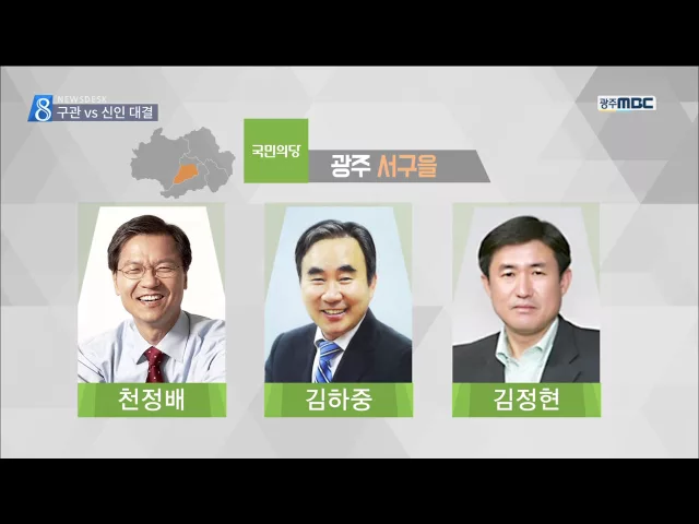 (앵커) 광주 서구 선거구에서는 현역 의원과 정치 신인들이 공천 경쟁을 벌이고 있습니다. 더불어민주당과 국민의당에서 어떤 후보들이 본선에서 맞대결할 지도 관심입니다. 윤근수 기자 (기자) 광주 서구을 선거구는 현역 의원이 당 대표라는 점이 특징적입니다. (CG)국민의당 천정배 공동대표가 서구을 출마를 예정한 가...