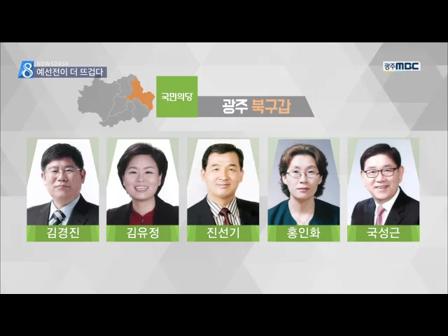 (앵커) 4.13 총선을 앞두고 각 정당들이 공천 절차에 들어갔습니다. 당내 경쟁도 뜨거워졌는데 특히 광주 남구와 북구갑 선거구에서는 예선을 통과하는 게 본선 못지않게 힘들 것으로 보입니다. 윤근수 기자 (기자) 광주 남구와 북구갑 선거구에서는 국민의당의 예선전이 뜨겁습니다. (CG)먼저 남구에서는 장병완 현 의원에...