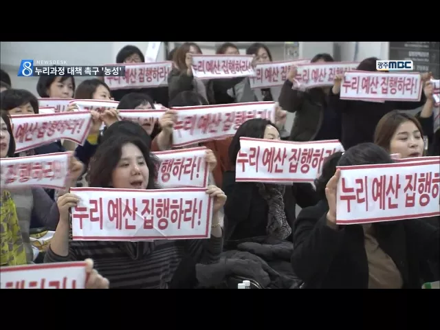 (앵커) 광주지역 어린이집 원장들이 시의회로 몰려가 연좌 농성을 했습니다. 누리과정 예산을 편성하라고 요구하기 위해서입니다. 정부와 교육청 사이의 극한 대결의 파장이 다른 곳으로도 번지고 있습니다. 먼저, 한신구 기자입니다. (기자) 아이들을 돌봐야할 시간에 어린이집 원장들이 광주시의회 맨바닥에 모여 앉았습...