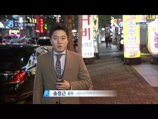 (앵커) 연말을 맞아 송년회 모임 등 유흥업소 밀집지역이 불야성을 이루고 있습니다. 그런 곳마다 취객을 노린 볼썽 사나운 호객 행위가 극성을 부리고 있지만 단속은 겉돌고 있습니다. 송정근 기자입니다. (기자) 술집과 노래방이 밀집해 있는 광주 상무지구. 네온 간판으로 불야성을 이루는 거리에 앳된 청년들이 취객에...