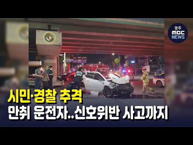 (앵커)처벌 수준을 높이고 아무리 홍보를 해도 잊을만하면 발생하는 음주운전 사고 소식입니다. 아슬아슬한 곡예 운전을 하던 음주운전자가 택시기사와 경찰의 추격을 피해 도주하다 결국 사고를 내 3명이 다쳤습니다. 이다현 기자가 취재했습니다. (기자)지난 5일 새벽 1시 반쯤 광주 서구의 한 도로.캄캄한 새벽에 전조등...
