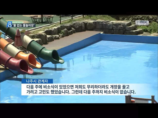 (리포트) 자치단체가 운영하는 물놀이장이 개장 열흘만에 문을 닫았습니다. 어이없게도 물놀이장에 물이 없어서라는데 헛걸음한 피서객들이 더위를 피하기는 커녕 더 열을 받았습니다. 송정근 기자가 현장 취재했습니다. (기자) 나주시가 운영하는 풀장 3개 규모의 생태 물놀이장입니다. 최고 1미터까지 채워져 있어야 할 ...