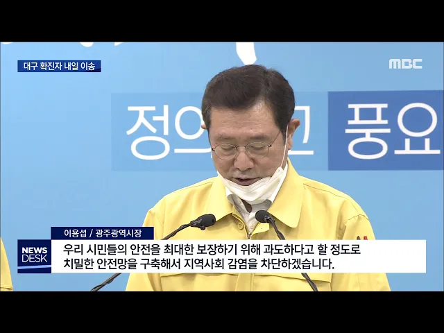 (앵커) 대구의 코로나 환자들이 내일부터 광주로 옵니다. 대구의 아픔을 두고만 볼 수 없다는 광주 공동체의 결단입니다. 광주시는 바이러스 차단을 위해 철저하게 방역하겠다면서 광주정신을 실천하는 데 시민들도 함께 해달라고 당부했습니다. 이계상 기자.. (기자) 코로나19 확진 환자를 대구에서 광주로 이송해서 치료...