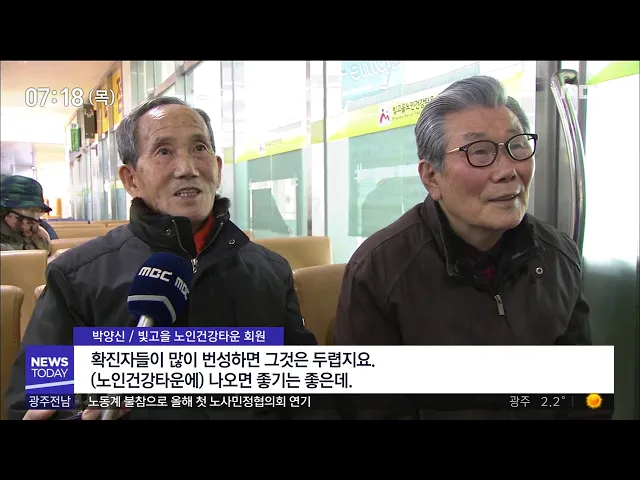 (앵커) 광주*전남에는 추가 확진자가 나오지 않으면서 접촉자들도 격리해제가 되고 있는데요. 하지만 대구에서 코로나19 확진자가 대규모로 나오면서 지역사회의 긴장감도 다시 높아지고 있습니다. 남궁 욱 기자가 취재했습니다. (기자) 오랜만에 친구들을 다시 만난 노인들의 표정에는 반가움이 가득합니다. 그동안 못했던...