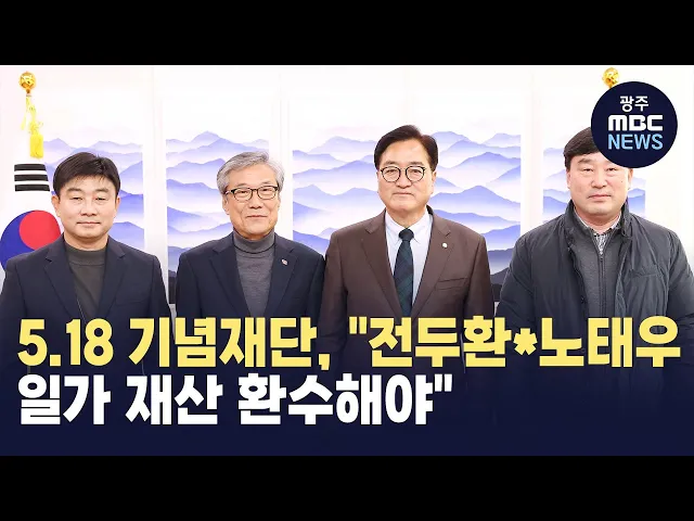 5.18기념재단은 어제(19)우원식 국회의장을 만나 전두환과 노태우 일가의 은닉 재산 환수를 위한입법을 촉구했습니다. 재단은 우원식 의장에게 "전두환과 노태우 일가의 부정 축재 재산이 새롭게 드러나면서 국민들이 분노하고 있다"며 "여야 의원들이 재산 환수 관련 법안을 발의한 만큼 법제화를 조속히 추진해달라"고 전...