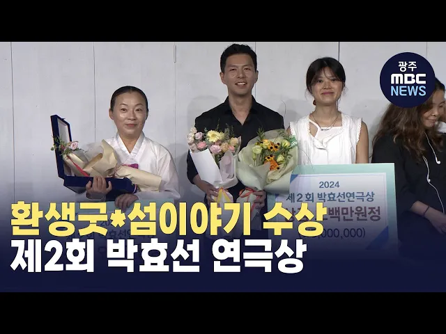 (앵커)5.18 당시 시민군 홍보부장이자 문화운동가였던 故 박효선 선생을 기리는연극상이 올해로 2회째를 맞았습니다.일본에서도 응모를 할 정도로 연극인들 사이에서 관심이 높았는데요.5.18을 다룬 '환생굿'과 4.3을 다룬 섬이야기가 수상했습니다.천홍희 기자가 시상식장을 다녀왔습니다. (기자)굿을 배웠지만 소리에 자...