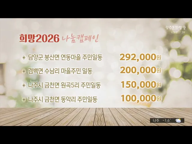 다음은 '희망 2026 나눔 캠페인'에 성금을 보내주신 분들입니다.담양군 봉산면 연동마을 주민일동 292,000겸백면 수남리 마을주민 일동 200,000나주시 금천면 원곡5리 주민일동 150,000나주시 금천면 동악리 주민일동 100,000나주시 금천면 신천4리 주민일동 100,000나주시 반남면 청송3리 주민일동 242,000나주시 반남면 ...