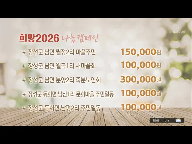 '희망 2026 나눔 캠페인'에 성금을 보내주신 분들입니다.'나주시 빛가람동 51통 주민일동 100,000나주시 빛가람동 52통 주민일동 100,000나주시 남평읍 수원1리 정판순 이장 외 주민일동 100,000나주시 남평읍 동사3리 박정아 이장 외 주민일동 200,000장성군 동화면 월산2리 홍학도 200,000화순군 성실가구 직원일동 300,0...
