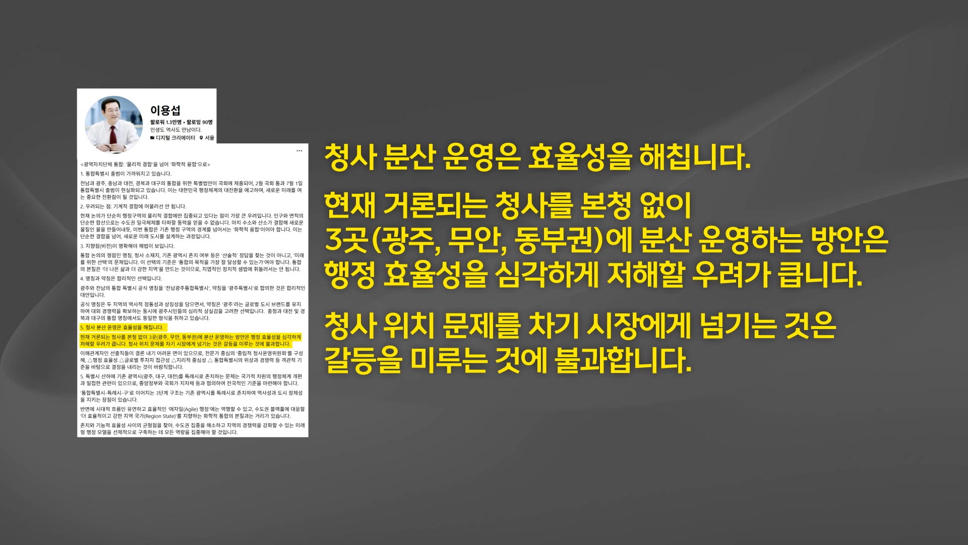논란인 통합특별시 주청사 문제와 관련해 이용섭 전 광주시장이 '중립적 청사운영위원회'구성을 제안했습니다.이 전 시장은 자신의 SNS에 올린 글에서현재 거론되는 청사를 본청 없이 3곳에 분산 운영하는 방안은 행정 효율성을 심각하게 저해할 우려가 크고 이 문제를 차기 시장에게 넘기는 것은 갈등을 미루는 것에 불과...